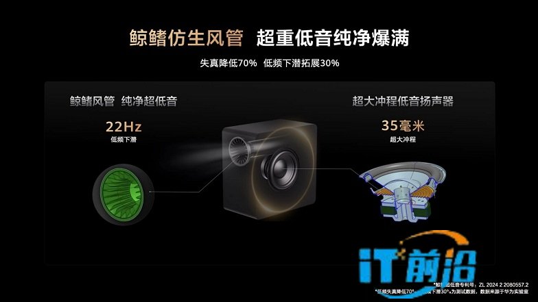 不仅如此,华为悦彰家庭影院拥有业内领先的鲸鳍超重低音,通过华为专利技术—鲸鳍仿生风管,可以降低风管内因气流高速流动而导致的噪声,打造更纯净的低音。