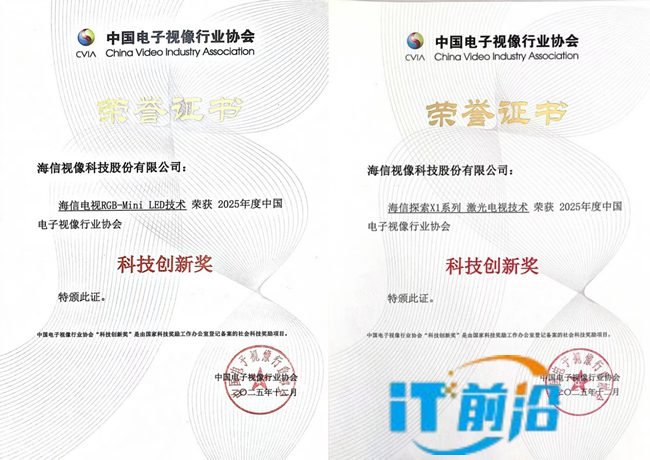 12月19日,中国电子视像行业协会在北京隆重举办了第二十一届中国音视频产业大会。会上对音视频产业取得的重大创新科技成果进行表彰,颁布了音视频领域最具权威的“科技创新奖”。海信RGB-Mini LED电视凭借全球首创的“RGB三维控色液晶显示技术”、海信激光电视探索X1系列凭借重塑家庭影院观影体验等方面的卓越创新,一并斩获2025年中国电子视像行业协会“科技创新奖”。
