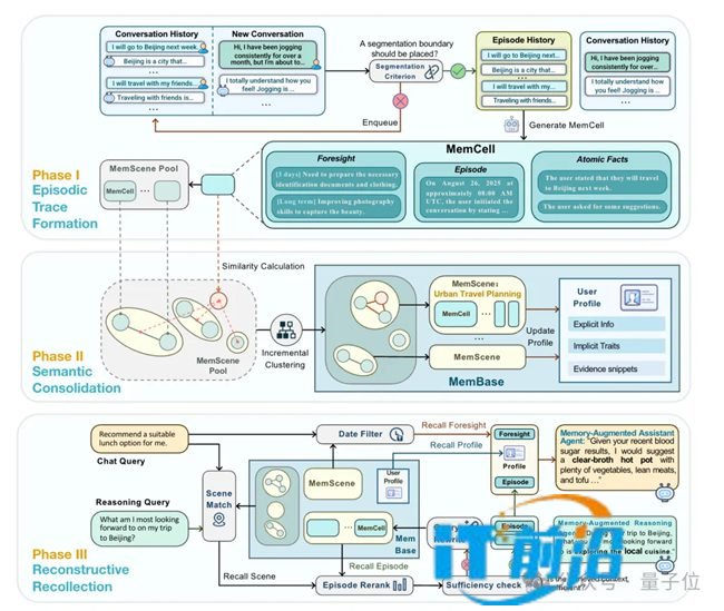 具体来讲,EverMemOS通过模拟人类记忆的形成并转化为计算框架,利用三阶段层层递进以实现大模型长期记忆的存储和提取: