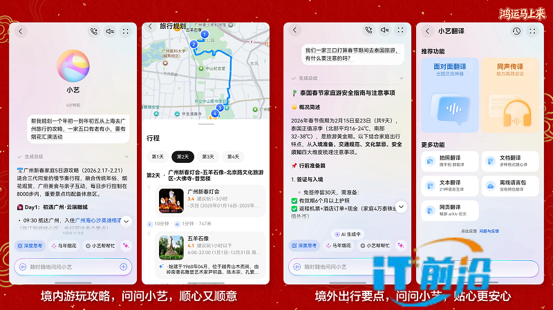 国内游先问问小艺,无论是去温暖如春的大湾区,还是去银装素裹的东三省,从日程安排到注意事项,把具体需求交待给小艺,TA能给你一份图文并茂的详细攻略。出境游之前问问小艺,当地注意事项一目了然;落地后再用小艺翻译,全程丝滑又流畅。马年春节出行安排,舒心又安心。