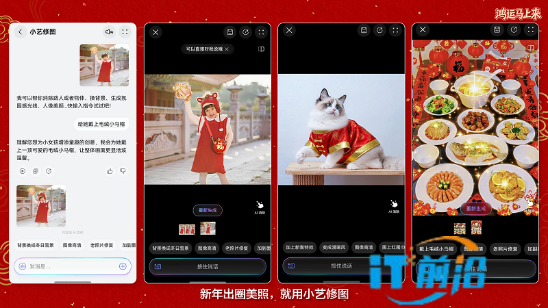 晒年夜饭、晒写真、晒气氛,这正是年轻人展现“主理”的时刻。超能小艺化身贴心“军师”,全程支招。年夜饭上桌后,照片一拍好,马上召呼小艺“给菜品加上闪光特效”,再来一句“再给照片添加些春节元素”,炮、福字、灯笼等年味装饰便让画面熠熠生辉。晒娃的,正在吩咐小艺“给她戴上毛绒小马帽”;晒毛孩子的,正在交待小艺 “给宠物添加新年装扮”……用小艺修图智能体,年味美照一说就有。