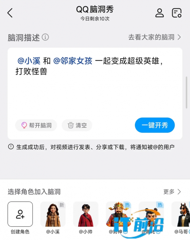 在社交娱乐方面,QQ于春节前上线了“脑洞秀”功能,为用户打造了个性化的创意表达场景。用户只需在QQ动态中找到入口,添加角色并描述脑洞,即可一键生成趣味短视频,还能自定义角色、开放权限与好友共创。无论是新年拜年场景的创意演绎,还是日常脑洞的可视化呈现,“脑洞秀”都将AI生成能力与社交关系链深度融合,让社交互动更具趣味性和个性化,成为年轻用户表达自我的新方式。